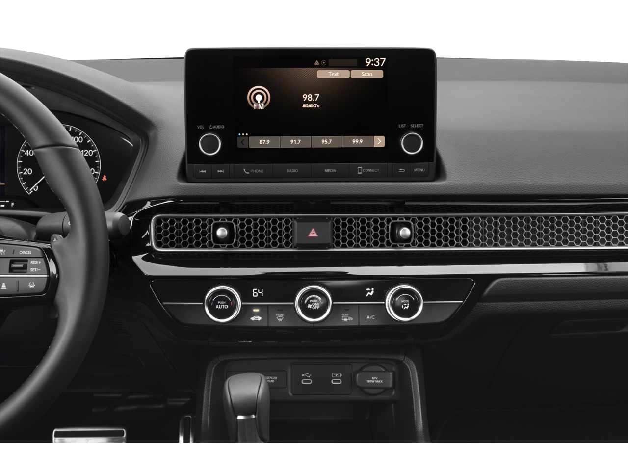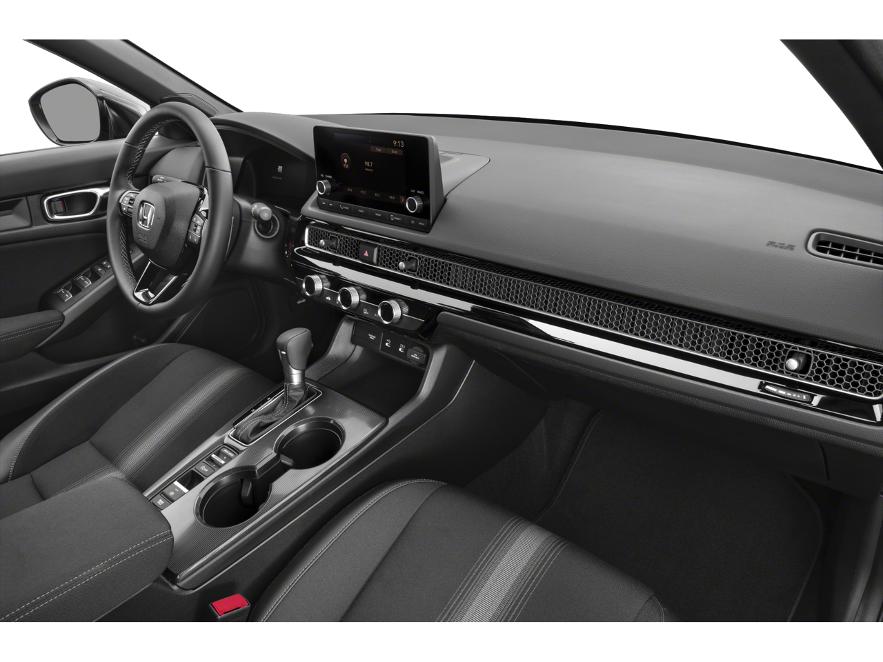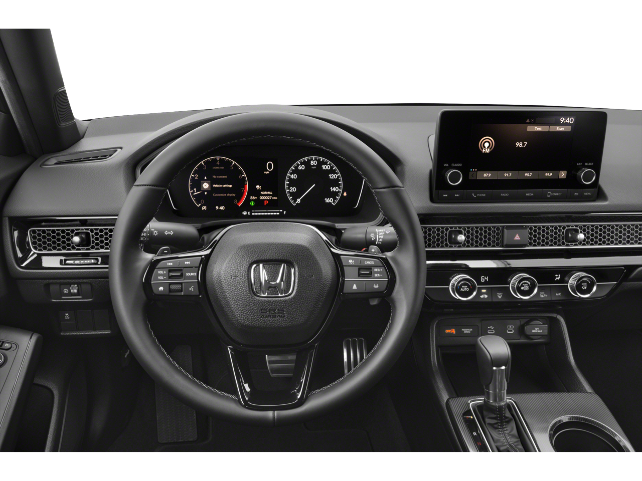 4-Wheel Disc Brakes, 8 Speakers, ABS brakes, Adaptive Cruise Control: Adaptive Cruise Control (ACC) with Low-Speed Follow, Air Conditioning, Alloy wheels, AM/FM radio, Apple CarPlay/Android Auto, Auto High-beam Headlights, Automatic temperature control, Blind Spot Information (BSI) System warning, Brake assist, Bumpers: body-color, Cloth/Leatherette Seating Surfaces, Delay-off headlights, Driver door bin, Driver vanity mirror, Dual front impact airbags, Dual front side impact airbags, Electronic Stability Control, Emergency communication system: HondaLink, Exterior Parking Camera Rear, Four wheel independent suspension, Front anti-roll bar, Front Bucket Seats, Front Center Armrest, Front reading lights, Fully automatic headlights, Heated door mirrors, Illuminated entry, Knee airbag, Leather Shift Knob, Leather steering wheel, Low tire pressure warning, Occupant sensing airbag, Outside temperature display, Overhead airbag, Panic alarm, Passenger door bin, Passenger vanity mirror, Power door mirrors, Power steering, Power windows, Radio data system, Radio: 180-Watt Audio System, Rear anti-roll bar, Rear seat center armrest, Rear side impact airbag, Rear window defroster, Remote keyless entry, Security system, Speed control, Speed-sensing steering, Split folding rear seat, Steering wheel mounted audio controls, Tachometer, Telescoping steering wheel, Tilt steering wheel, Traction control, Trip computer, and Wheels: 18" Gloss Black Alloy.